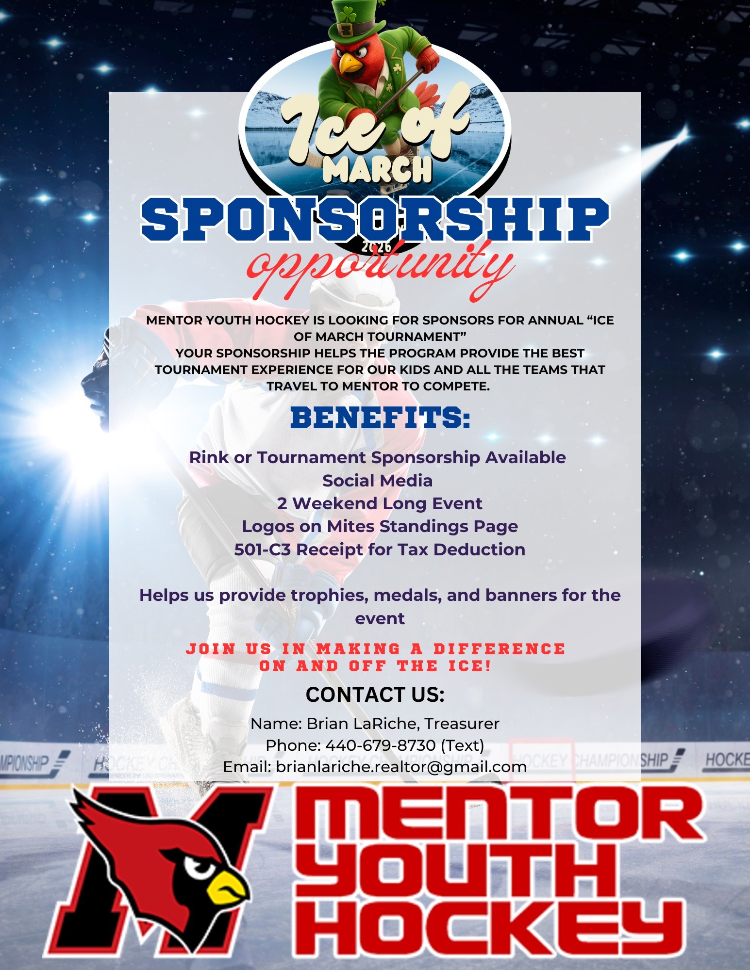 Mentor Youth Hockey is looking for annual Ice of March Tournament Sponsors. Your sponsorhips helps the program provide the best tournamet experience for our kids and all the teams that travel to Mentor to compete.