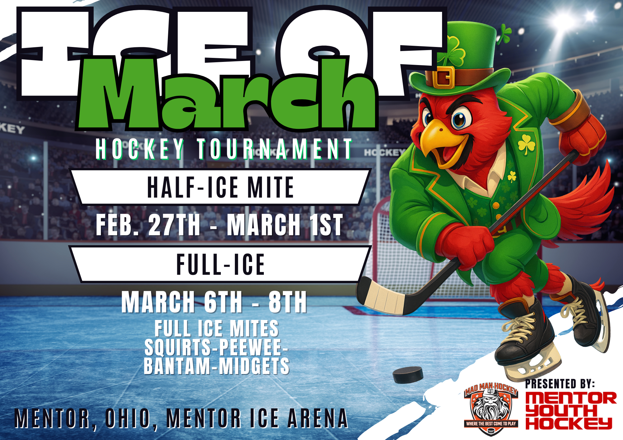 Mentor Youth Hockey is partnering with Mad Man Hockey to bring you Mentor’s Annual Ice of March Tournament. The largest youth hockey tournament hosted in Ohio. This tournament comes with the professionalism and organization that a tournament company brings but maintains its fun tournament atmosphere as enjoyed in years past. Come join us and make Ice of March your last puck drop of the season!